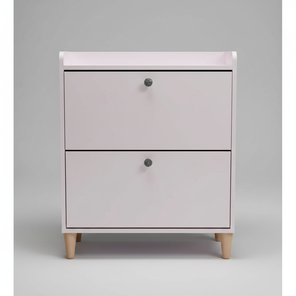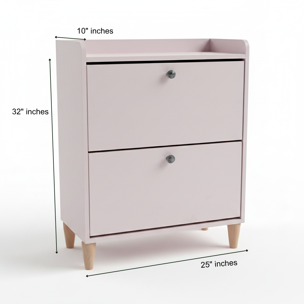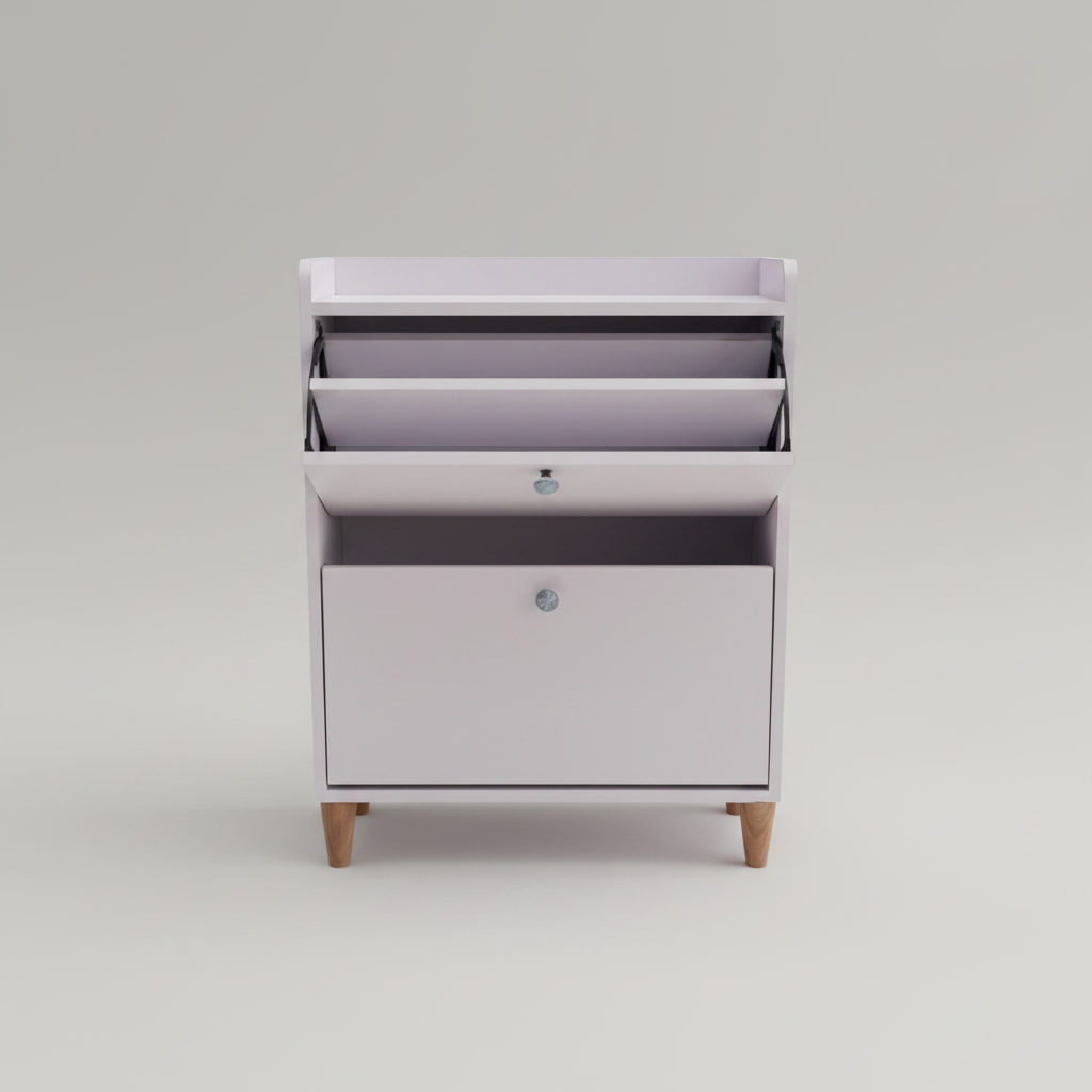 Constructed from premium engineered wood with a soft matte finish, this cabinet features two smooth-gliding tilt-out compartments. Inside, you can choose to integrate industrial metal mesh dividers (sold separately) to promote airflow and keep your shoes fresh. The unit is crowned with a unique gallery-style top, perfect for creating a “drop zone” for your essentials. Supported by solid wood legs, it provides a sturdy yet elegant footprint that complements any modern interior, from minimalist lofts to cozy family homes.