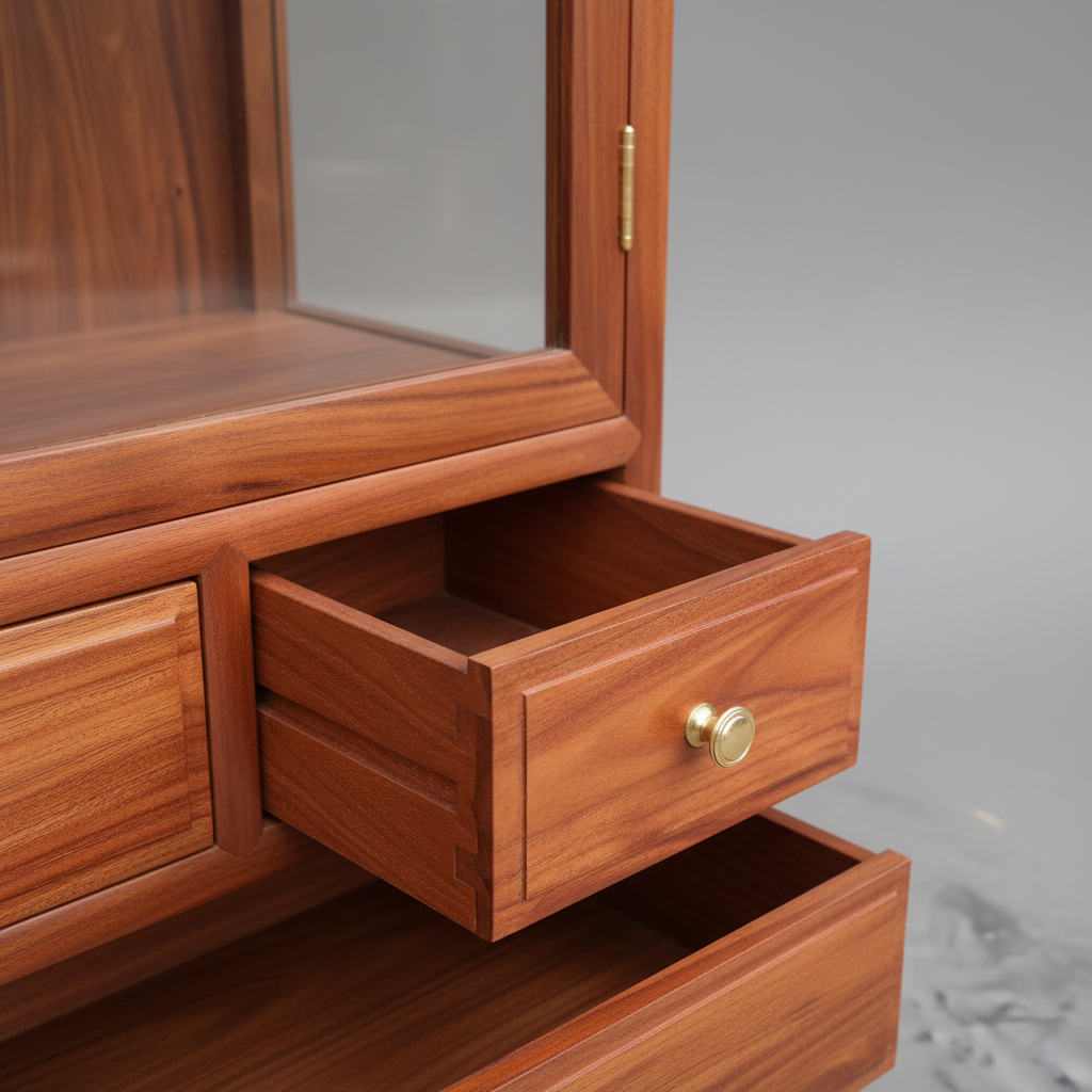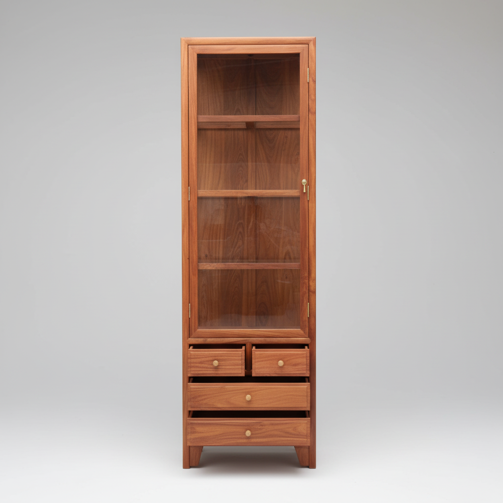 The lower half is engineered for utility, housing two small accessory drawers and two full-width deep drawers. Each drawer is finished with minimalist brass-toned hardware, ensuring smooth operation and a timeless look. Whether used as a high-end crockery unit, a library showcase, or a retail display, the 61-A provides a sturdy, sophisticated silhouette that stands the test of time.
