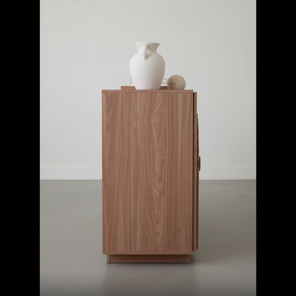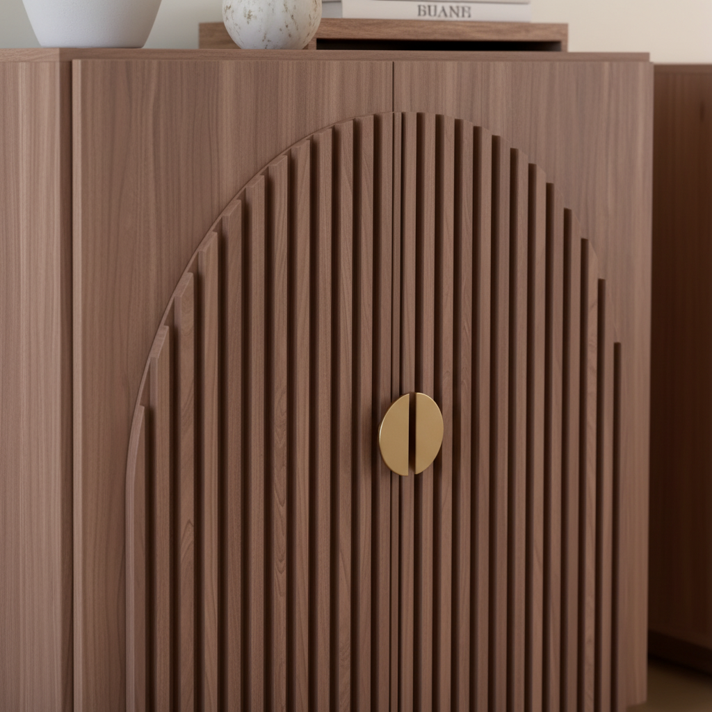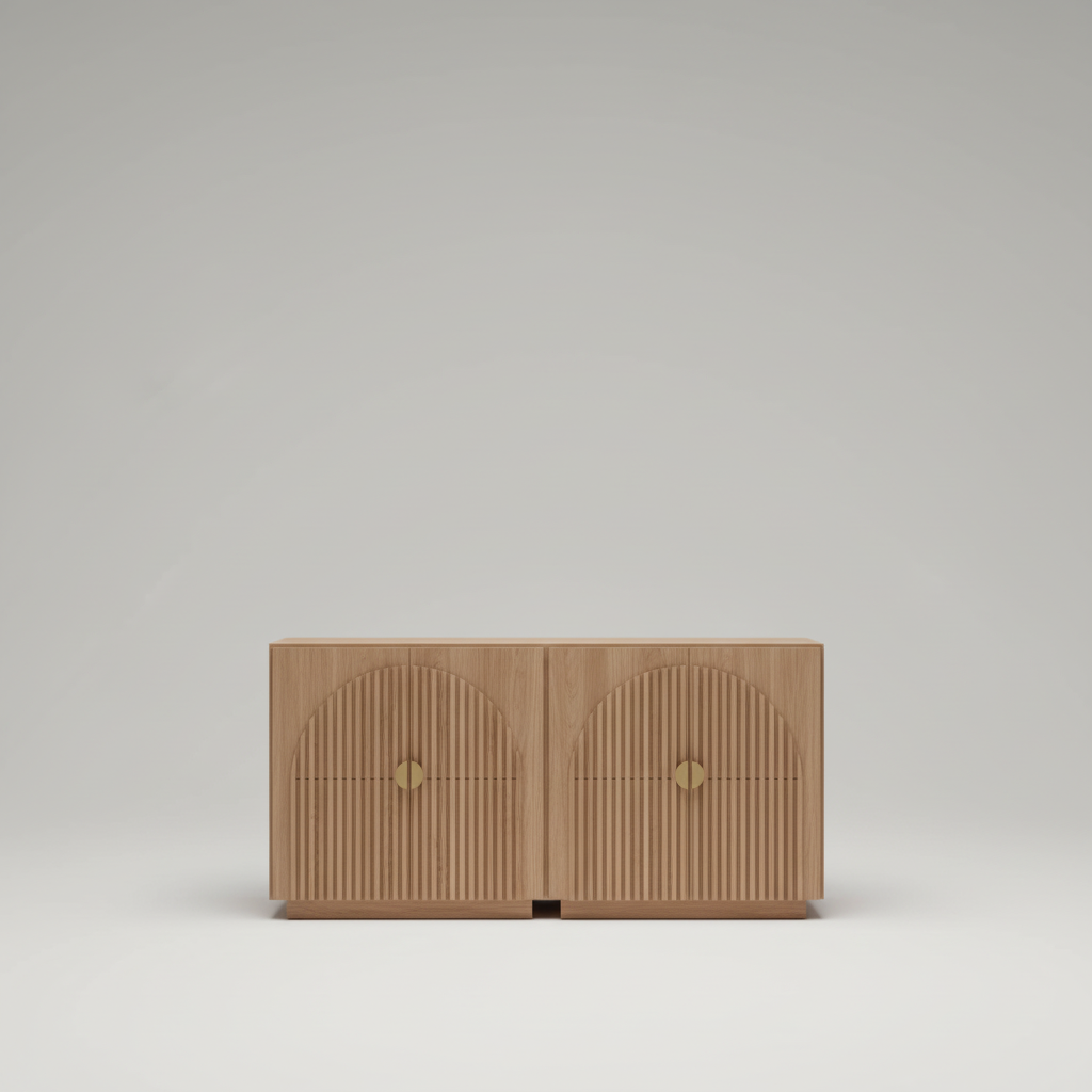 Transform your space with the Arch-Fluted Natural Wood Cabinet, where high-end artistry meets practical storage. The centerpiece of this design is the precision-cut fluted arch that spans both doors, creating a rhythmic, textured focal point that plays beautifully with light and shadow.