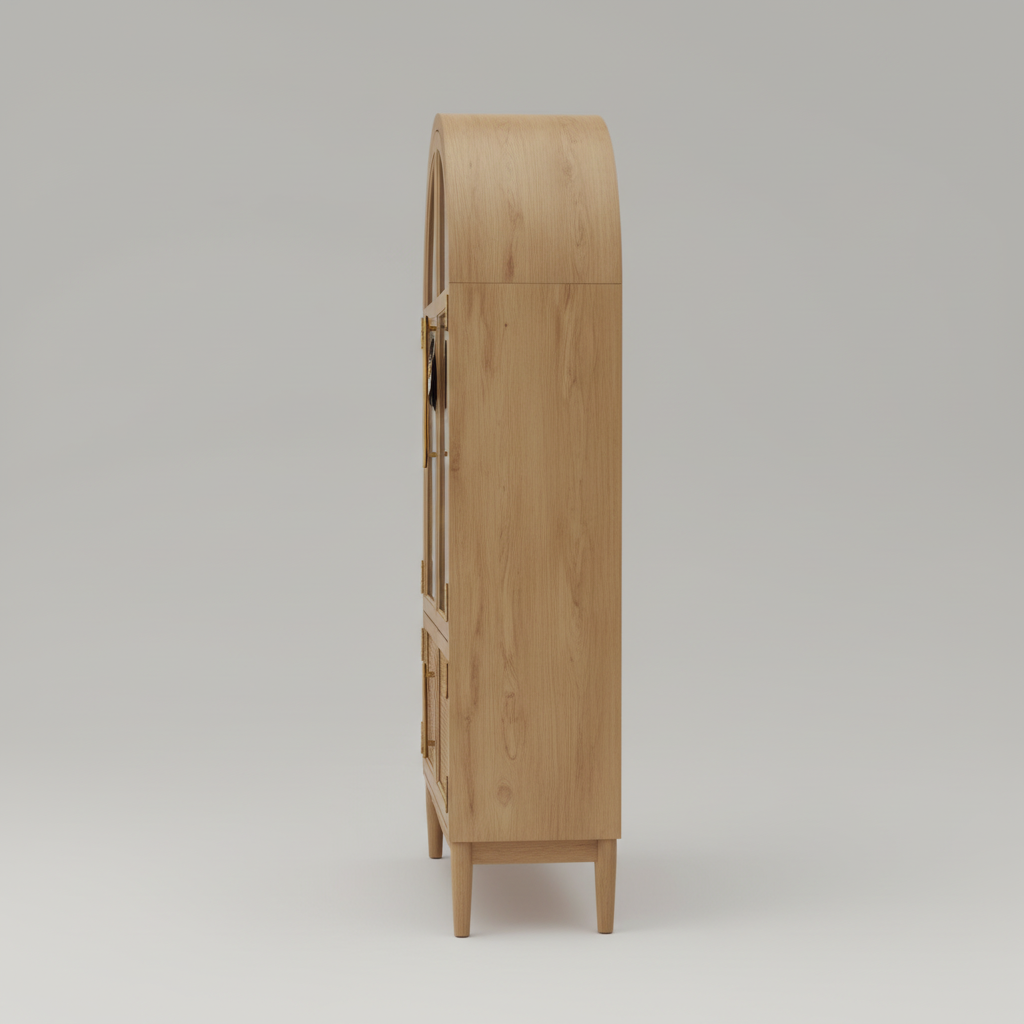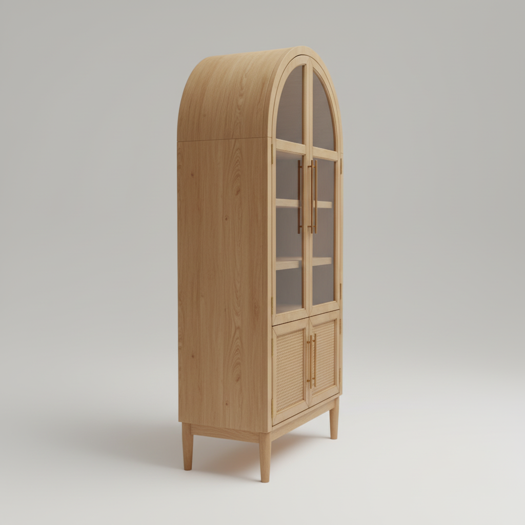 Redefine your home’s focal point with the Arched display cabinet with Rattan Mesh Storage. This piece draws inspiration from classic architectural silhouettes, featuring a stunning “Cathedral” arched top that adds height and grace to any room. The upper section provides an expansive display area with four tiers of shelving, ideal for showing off fine china, rare books, or curated collectibles.