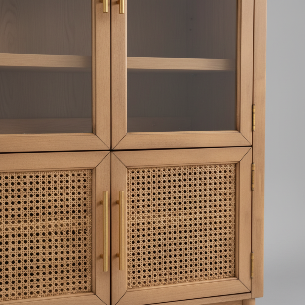 The base of the unit offers functional, hidden storage behind two doors inset with high-quality rattan-style mesh. This breathable texture adds a layer of organic warmth, beautifully contrasted by sleek, vertical gold handles. Set on elegant tapered legs, this cabinet maintains an airy feel despite its commanding height. It is a sophisticated storage solution for those who want to blend natural textures with high-design structure.
