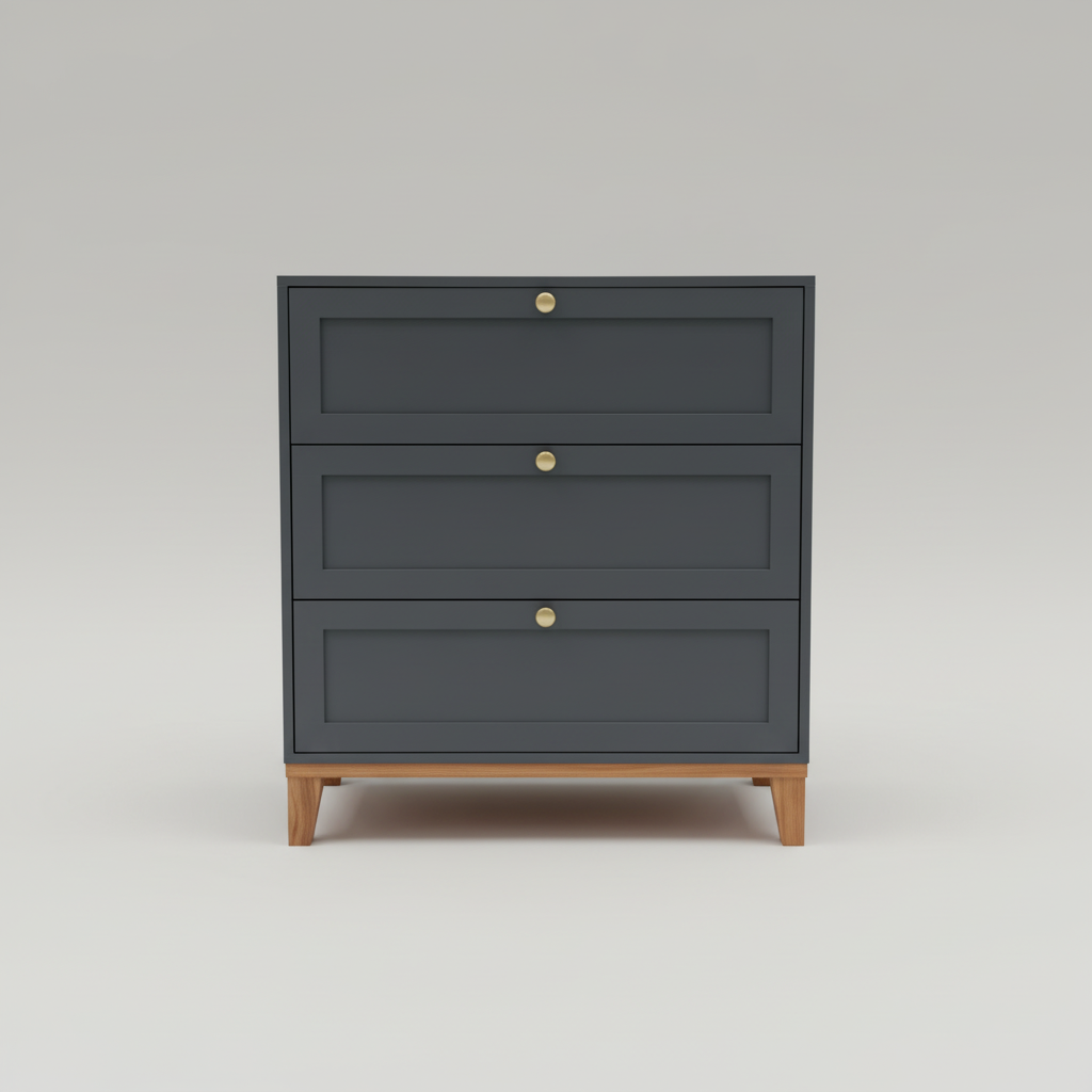 Be the first to review “Charcoal Grey 3-Drawer Dresser – Mid-Century Modern Chest with Solid Wood Tapered Legs & Gold Accents” Cancel reply