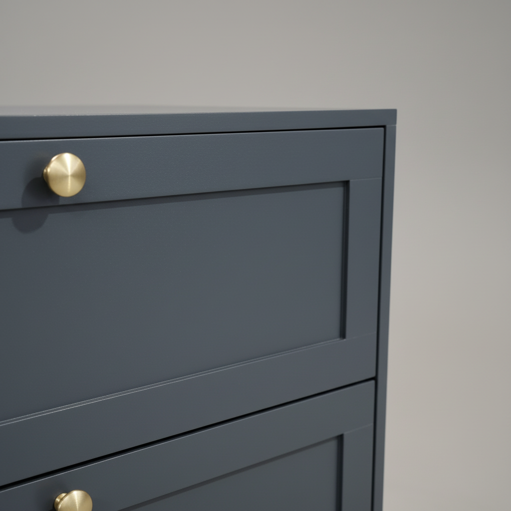 Refined elegance meets practical storage. The Homs Lux 3-Drawer Chest features a striking charcoal matte finish accented by brushed gold hardware and a natural wood base. Its compact footprint and deep drawers make it an essential piece for organized, stylish living.