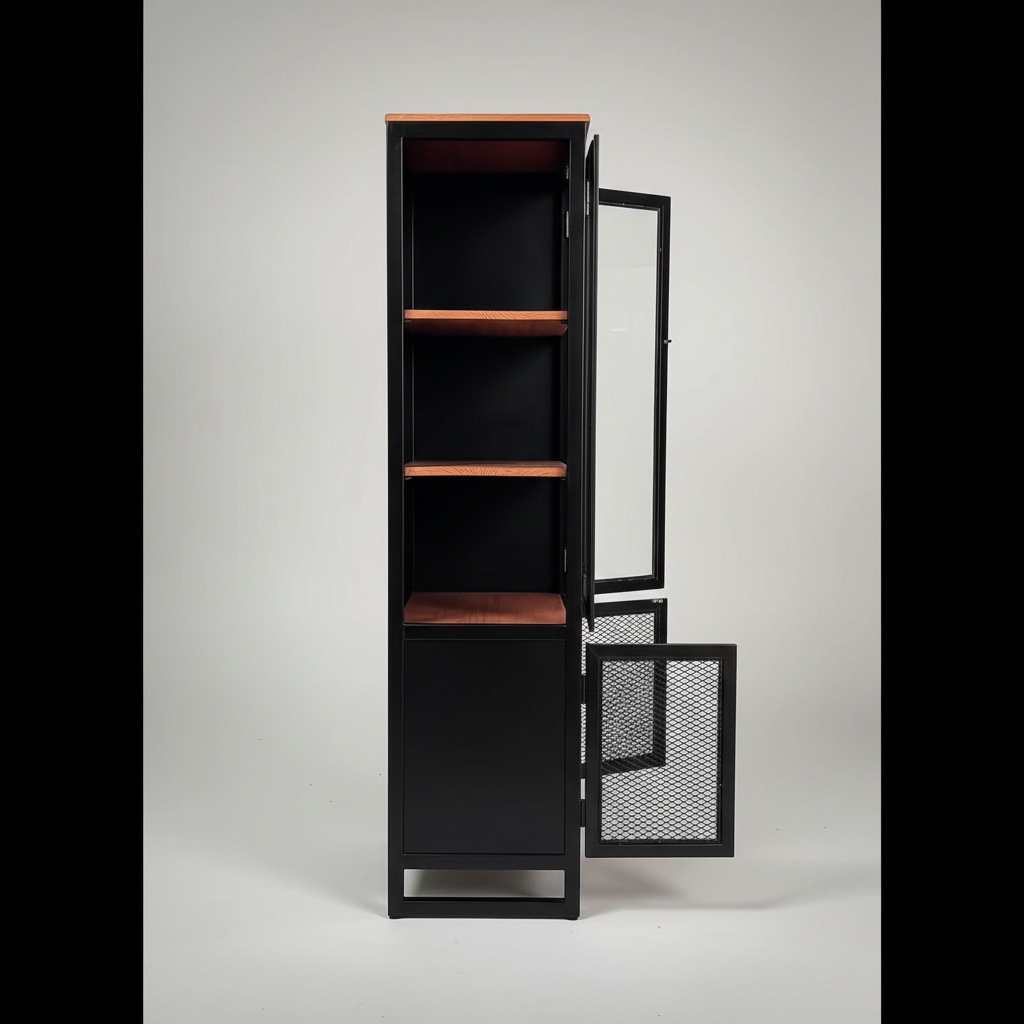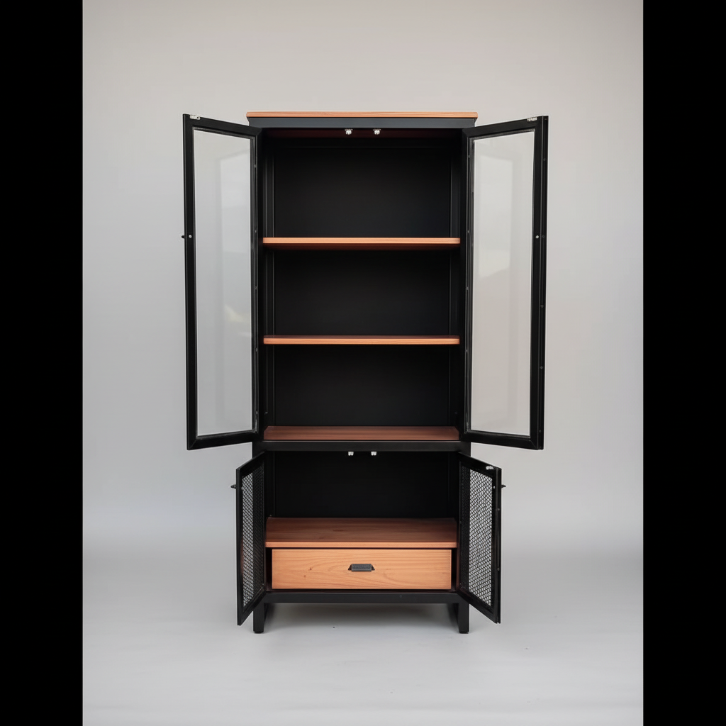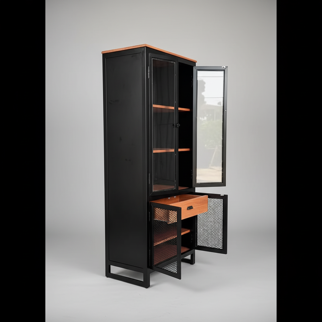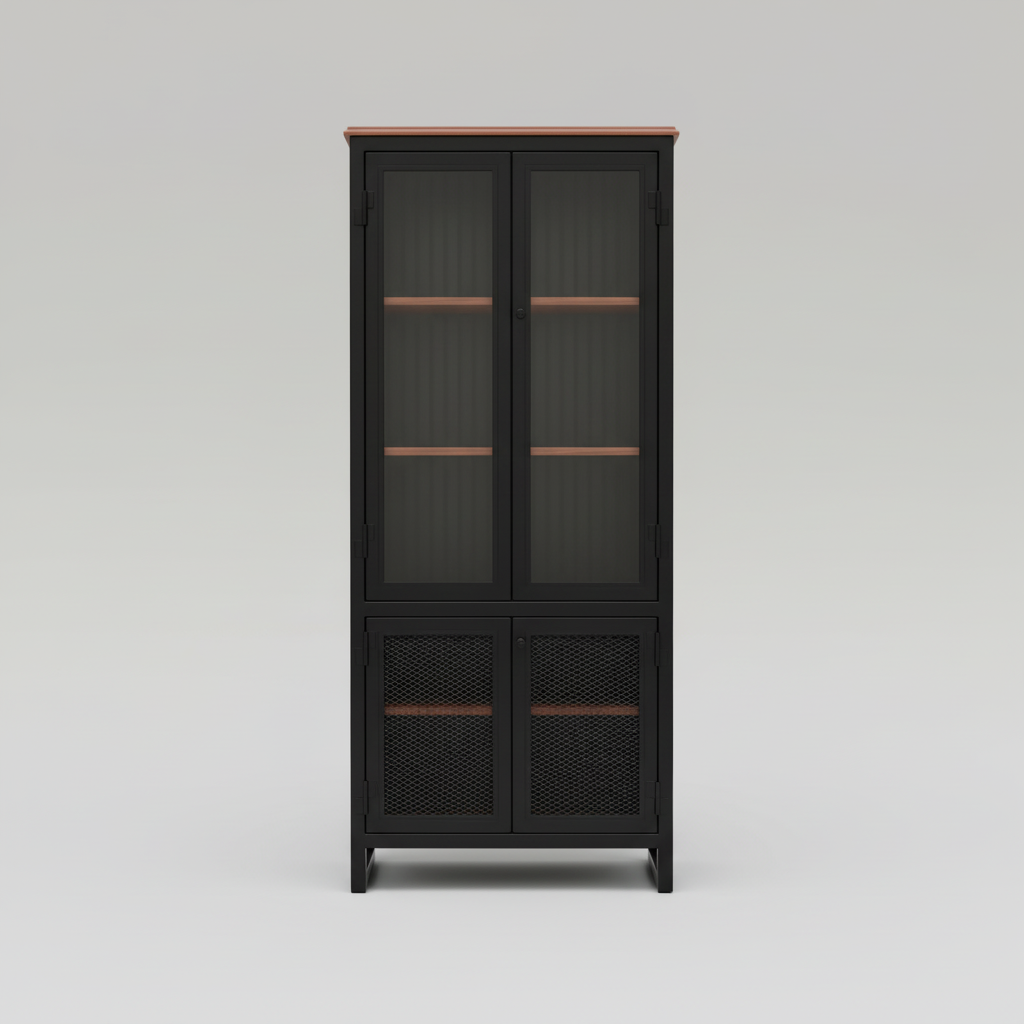 Make a bold statement with the Homs Lux Apothecary Metal Mesh Display Cabinet, where industrial engineering meets artisan design. The upper section features dual transparent glass doors, offering an unobstructed view of your finest glassware, collectibles, or books across three sturdy wood-lined shelves.