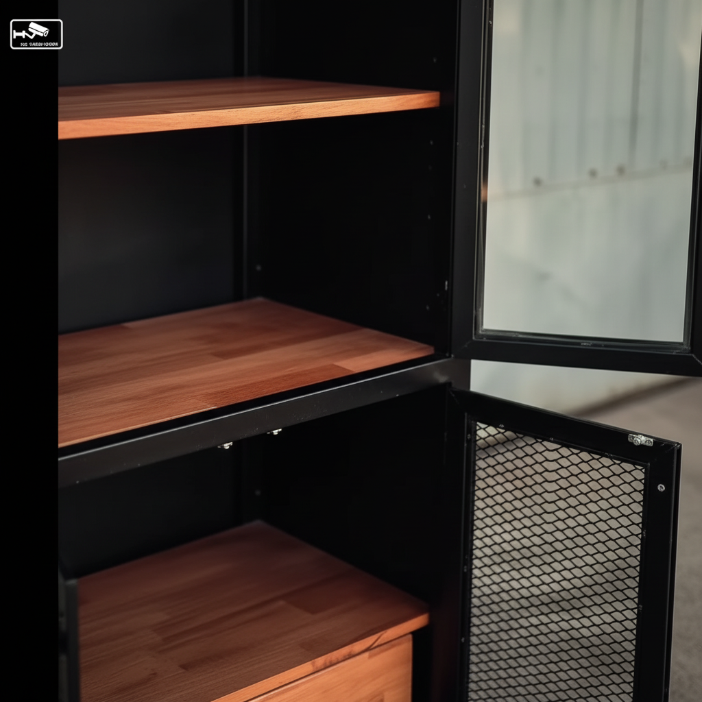 The lower half of the unit transitions into a rugged, matte black metal mesh enclosure, providing a breathable and secure space for larger household items. Within the mesh base lies a deep, solid wood drawer for concealed storage of documents or accessories. Crafted with a powder-coated steel exoskeleton and moisture-resistant wood panels, this hutch is as durable as it is visually striking, perfect for the modern living room, dining area, or executive office.