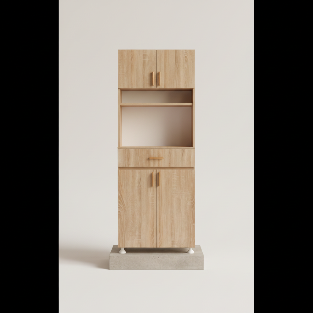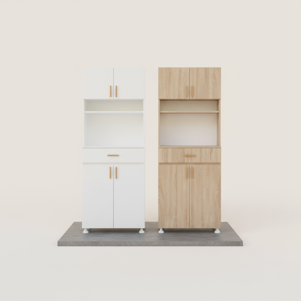 Streamline your kitchen with the Oslo Multi-Functional Kitchen Pantry Cabinet. This tall, space-saving unit features a versatile open nook—perfect for a microwave or coffee station—plus four cabinet doors and a smooth-glide drawer to keep your essentials organized and out of sight. Available in minimalist White or warm Light Oak.