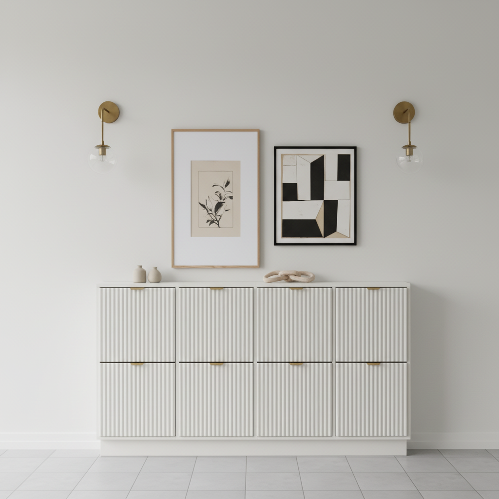 Make a sophisticated statement the moment you walk through the door. The Aurora Fluted Shoe Storage Console is designed for those who refuse to sacrifice style for organization. The rhythmic, vertical ribbing on the cabinet faces creates a play of light and shadow, adding architectural depth to any room.
