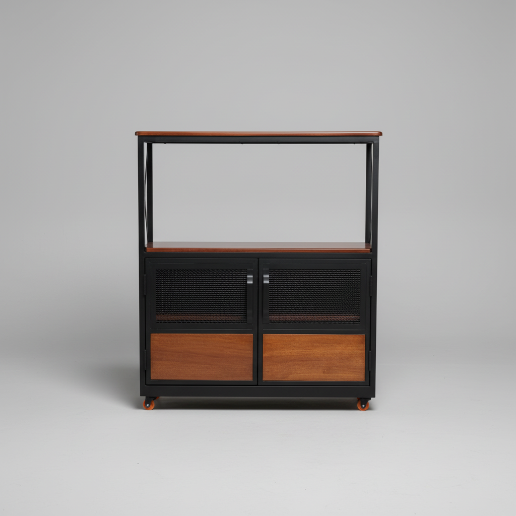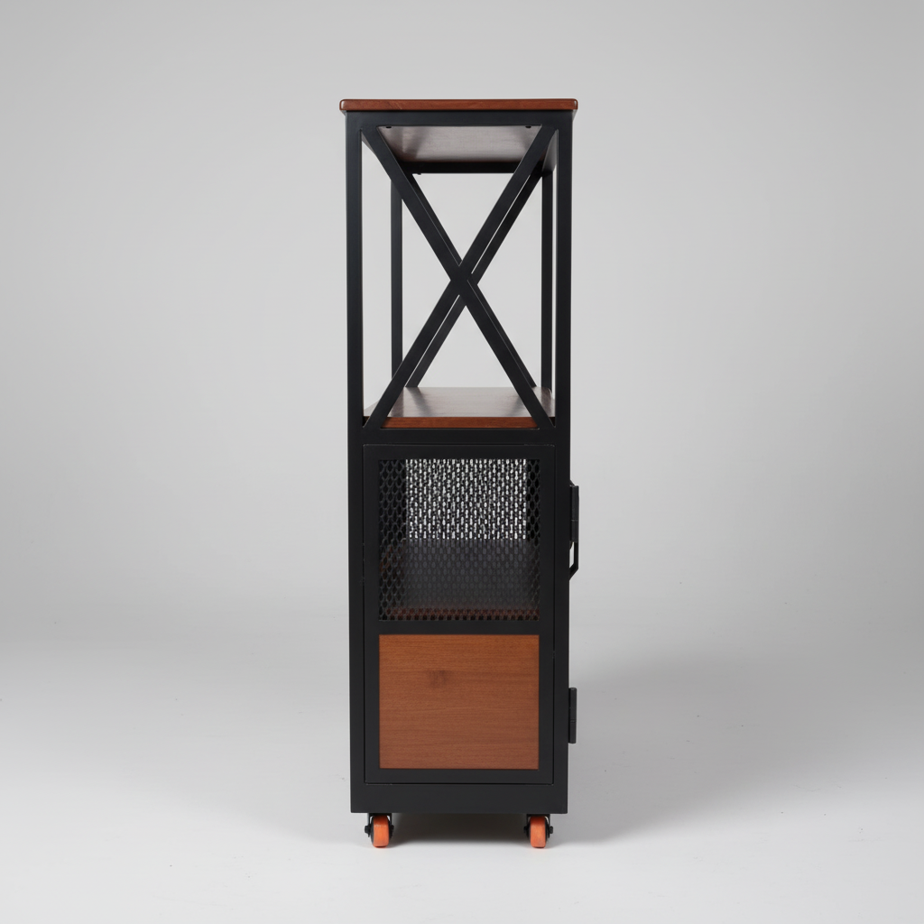 Efficiency meets industrial elegance with the Homs Lux Mobile Utility Station. Designed for the dynamic home, this cart serves as the ultimate “moveable feast,” perfect for hosting dinner parties or expanding your kitchen workspace. The top surface and middle shelf are finished in a deep, natural wood grain, providing a heat-resistant area for coffee machines or serving trays.