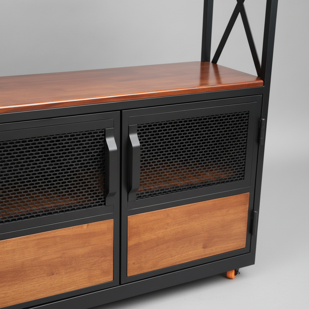 The lower compartment is enclosed by two magnetic-latch doors featuring fine metal mesh panels. These panels offer a sophisticated “peek-a-boo” aesthetic while ensuring maximum airflow for stored linens or pantry dry goods. Supported by high-quality orange-accented casters, this unit can be effortlessly moved from the kitchen to the dining room and locked securely into place when in use.