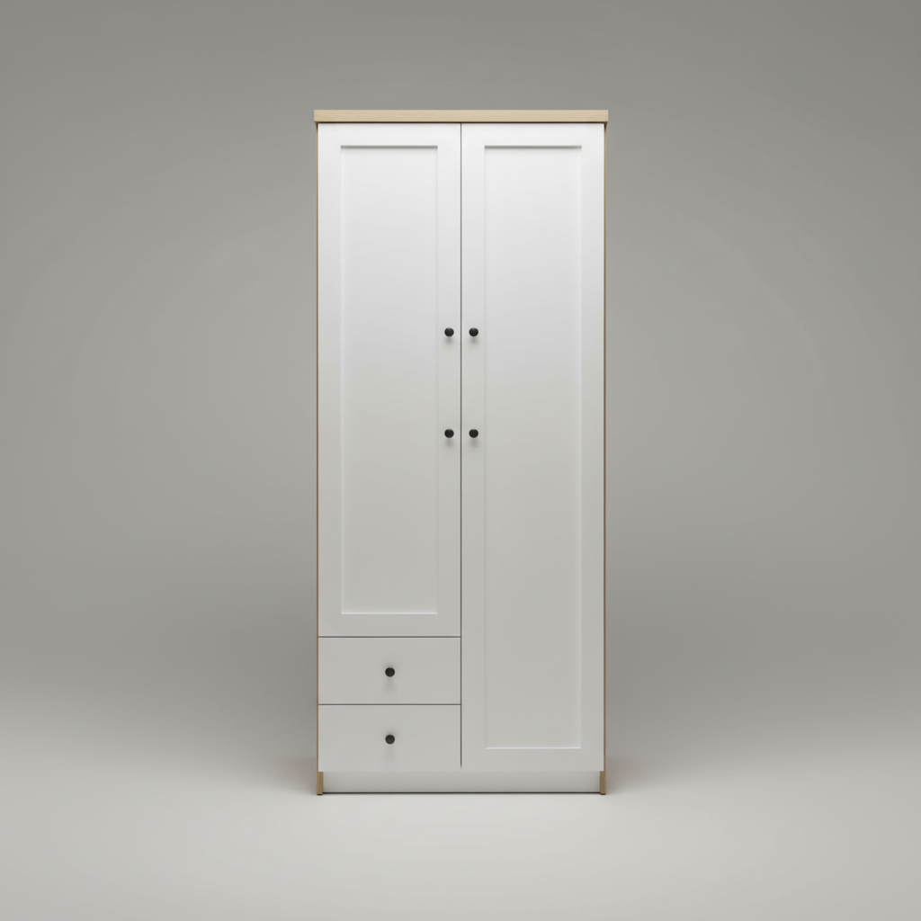 The asymmetrical door layout offers a refreshing break from traditional wardrobe designs. The left side features a shorter door paired with two deep, smooth-glide drawers—perfect for folded garments or accessories—while the right side offers a full-length door ideal for hanging items or tall storage. Finished with minimalist black circular knobs, this piece brings a sense of organized calm to any bedroom, guest room, or entryway.
