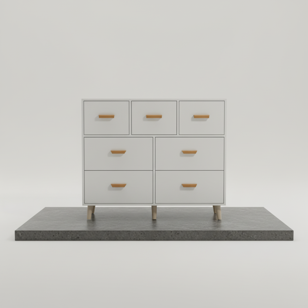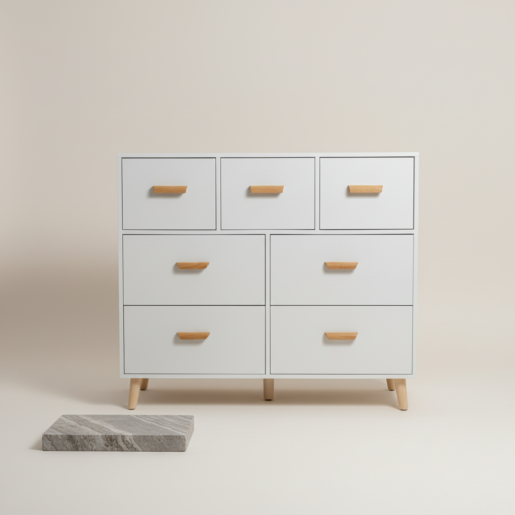 The Homslux Malmo Chest of Drawers with Multi-Size Storage reimagines classic storage with a focus on geometric balance and natural textures. Its clean, white matte finish is punctuated by solid wood hardware, creating a look that is both bright and grounding. Designed to fit seamlessly into nurseries, master suites, or even home offices, the Malmo is as versatile as it is beautiful.