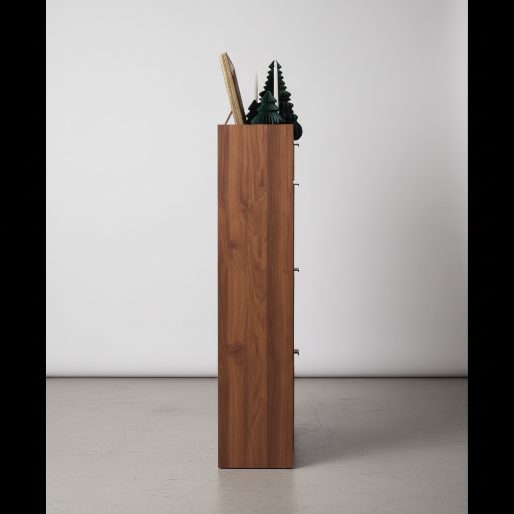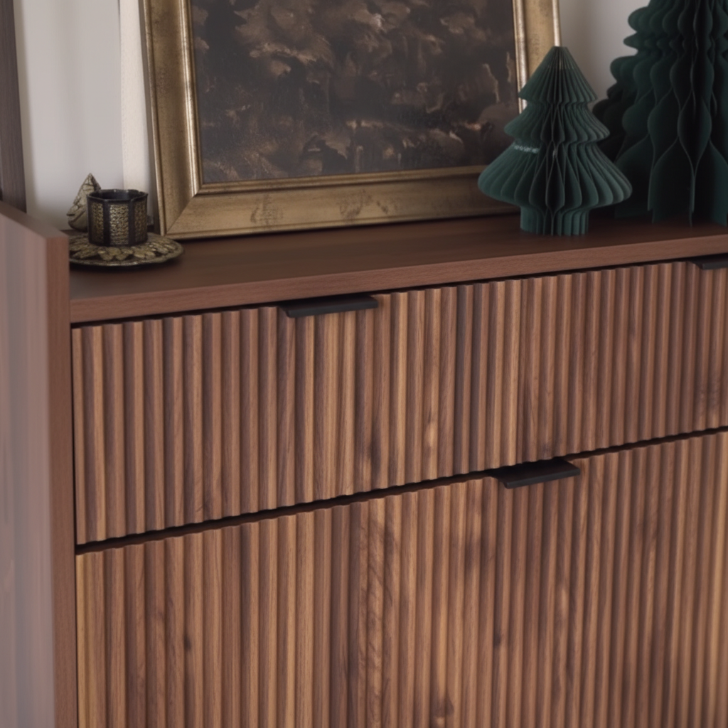 The Elara Shoe Cabinet is a masterclass in functional aesthetics. Its ultra-slim profile makes it an ideal solution for narrow hallways, apartments, or compact mudrooms. By utilizing a vertical tilt-down mechanism, it conceals your footwear behind a sleek, handle-integrated facade, keeping your living space looking curated and clean.