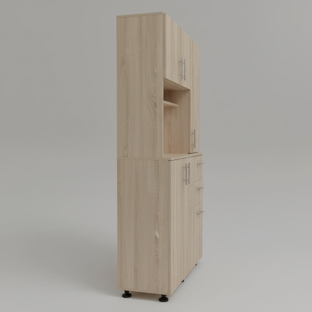 The lower base is anchored by a spacious double-door cabinet and a stack of three precision-glide drawers for smaller office or kitchen supplies. Finished in a warm, natural light oak texture with sleek silver-tone hardware, this unit provides a clean, professional look that brightens any room. Elevated on adjustable industrial-style feet, it ensures stability and easy floor maintenance, making it a reliable staple for busy workspaces or high-traffic kitchens.