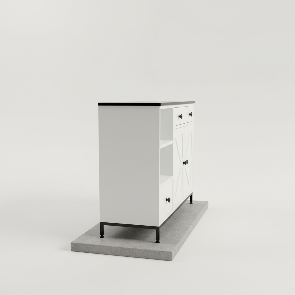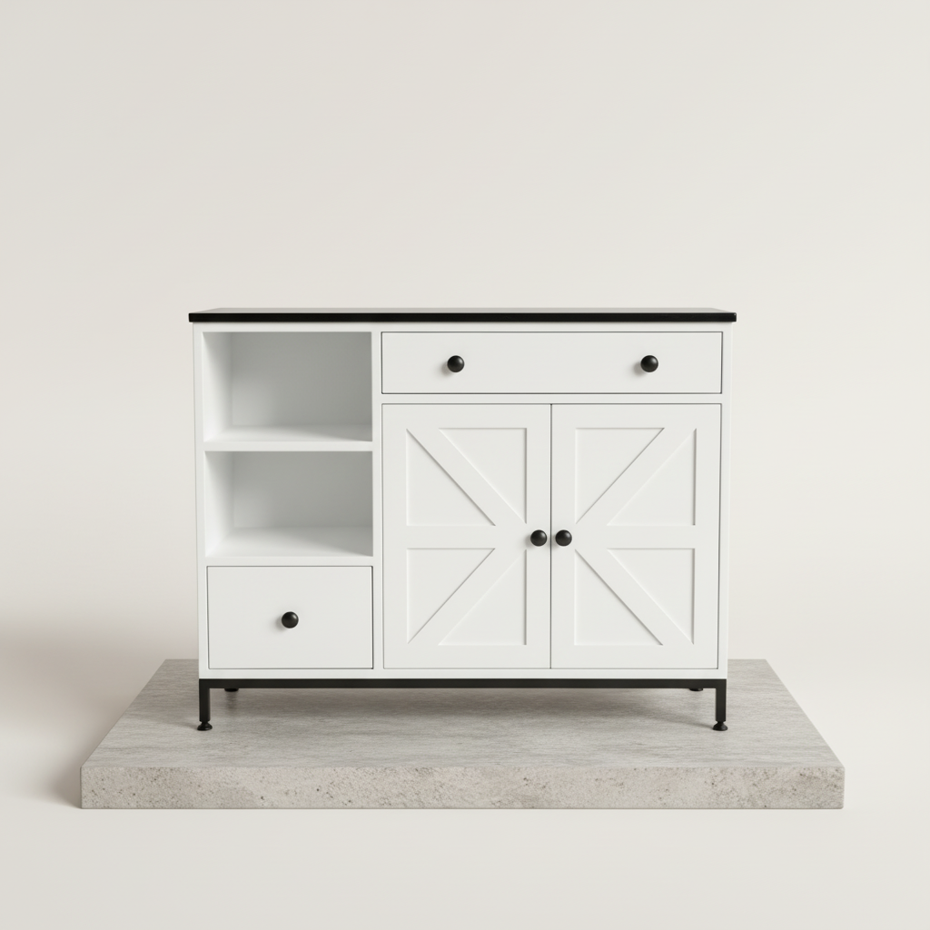 Elevate your living space with the Homslux Modern Farmhouse Multipurpose Storage Cabinet & Sideboard. This stunning white cabinet blends rustic charm with industrial accents, featuring two spacious drawers, open cubby shelving, and a double-door cabinet with signature “X” frame detailing. Supported by a sleek black metal base, it offers the perfect combination of durability and contemporary style.