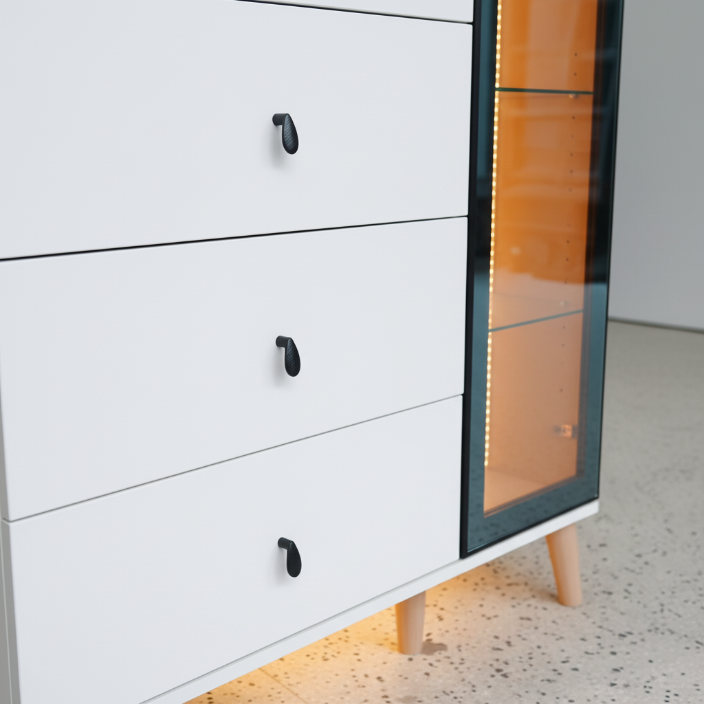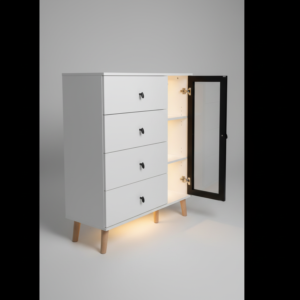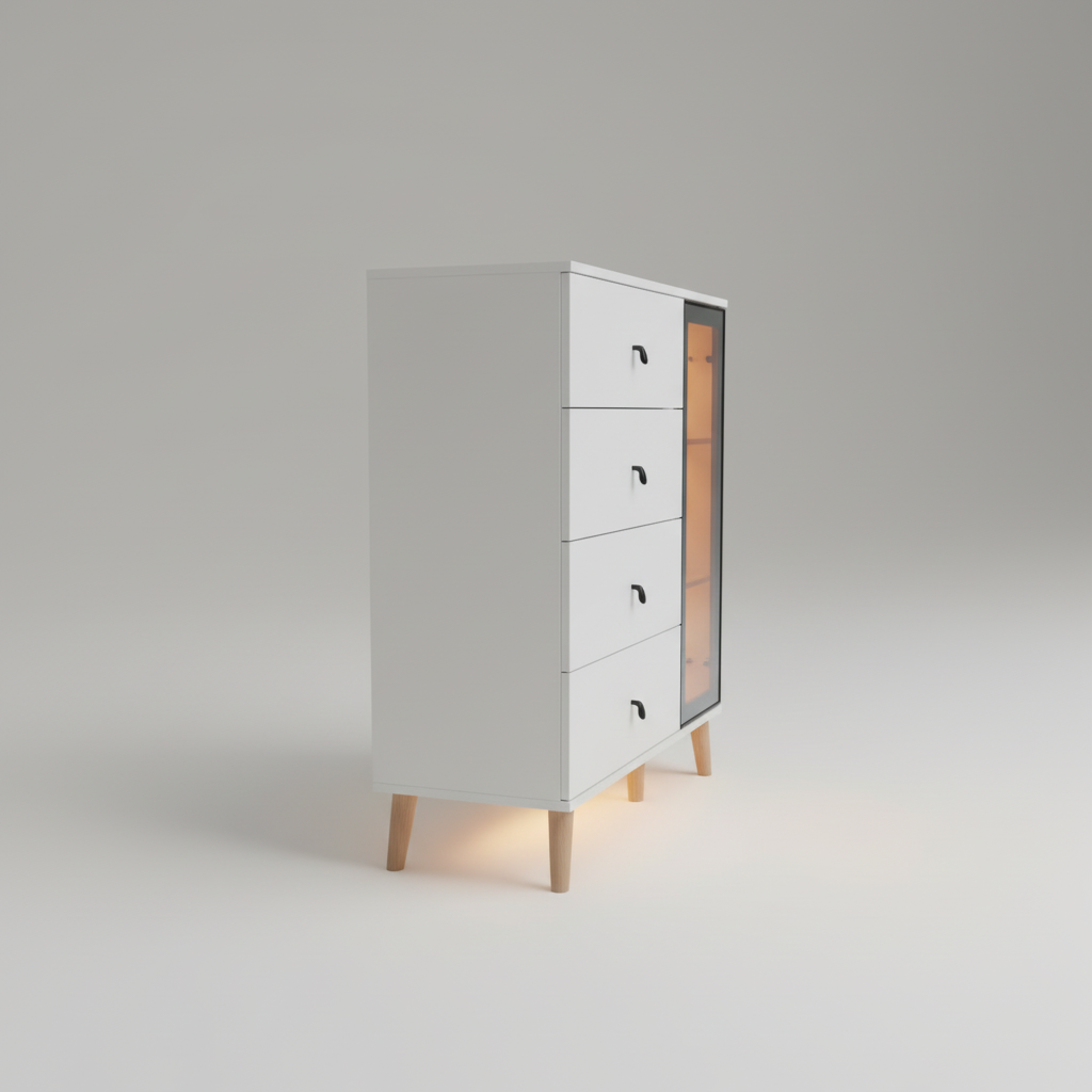 The Homslux Malmo Chest of Drawers with Multi-Size Storage reimagines classic storage with a focus on geometric balance and natural textures. Its clean, white matte finish is punctuated by solid wood hardware, creating a look that is both bright and grounding. Designed to fit seamlessly into nurseries, master suites, or even home offices, the Malmo is as versatile as it is beautiful.