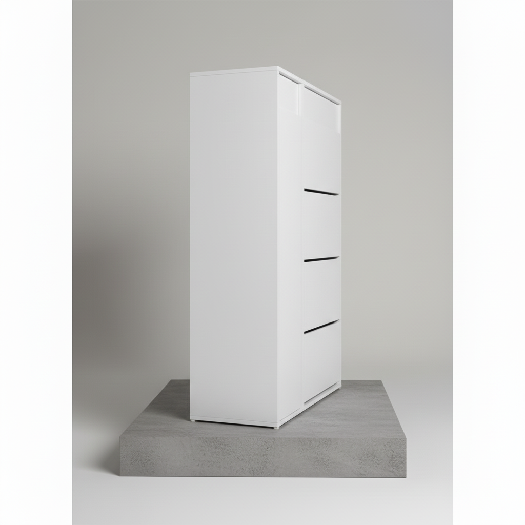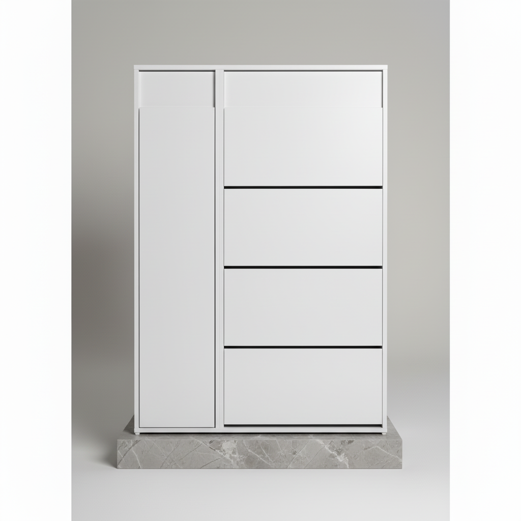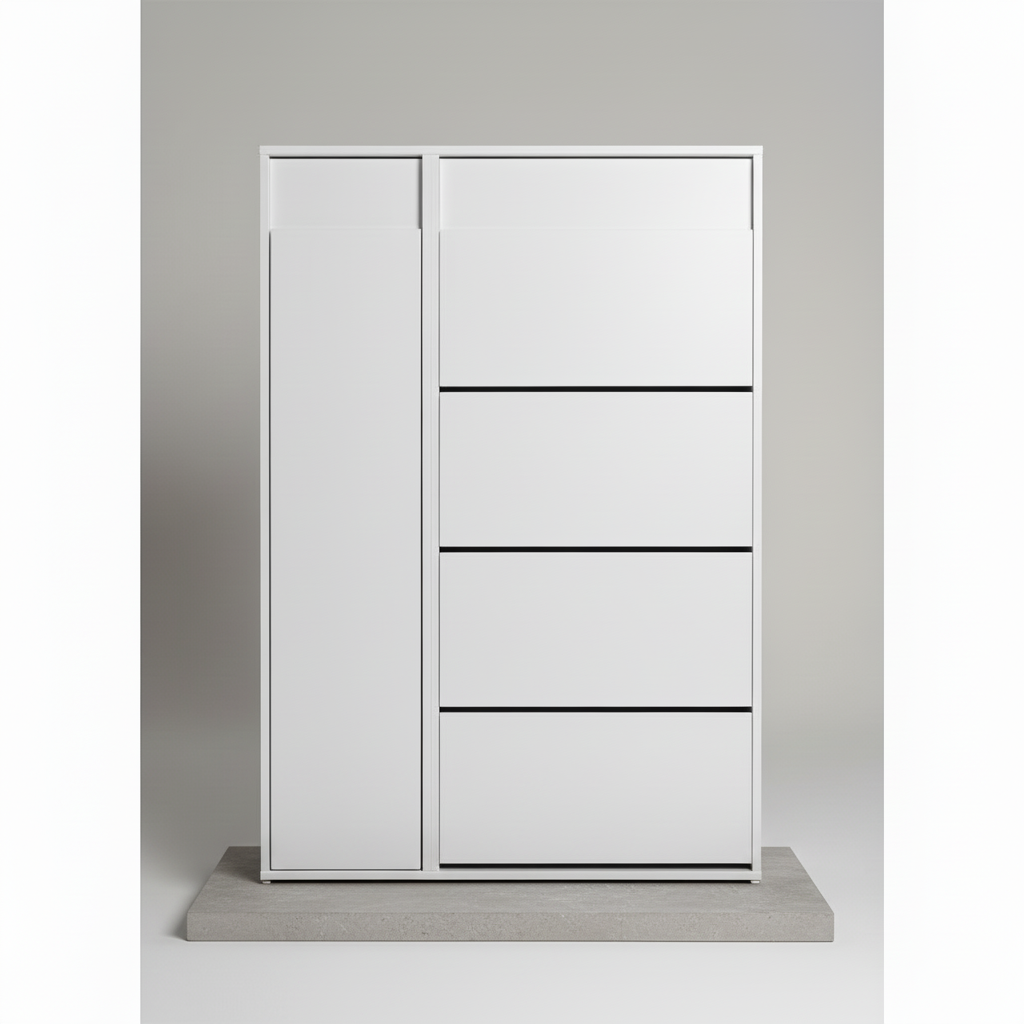 The Elara Shoe Cabinet is a masterclass in functional aesthetics. Its ultra-slim profile makes it an ideal solution for narrow hallways, apartments, or compact mudrooms. By utilizing a vertical tilt-down mechanism, it conceals your footwear behind a sleek, handle-integrated facade, keeping your living space looking curated and clean.