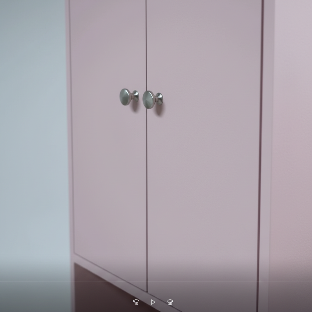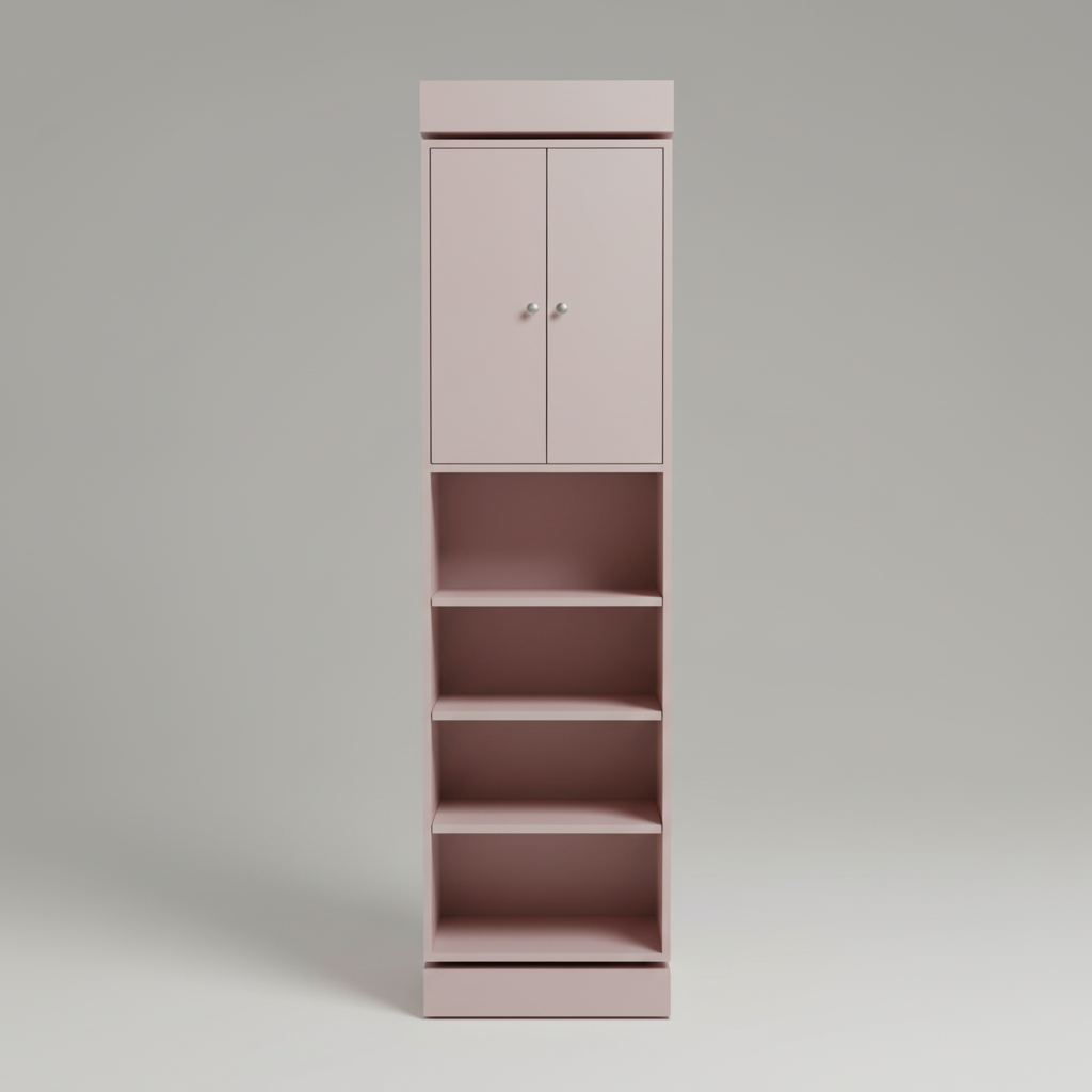 The upper section features a sleek double-door cabinet with minimalist silver-tone knobs, perfect for tucking away personal items or clutter. The unique dusty rose finish provides a soft, sophisticated pop of color that pairs beautifully with neutral palettes. Whether utilized as a nursery bookshelf, a bathroom linen tower, or a hallway organizer, its sturdy plinth base and slender profile ensure it fits perfectly into narrow corners and tight spaces.