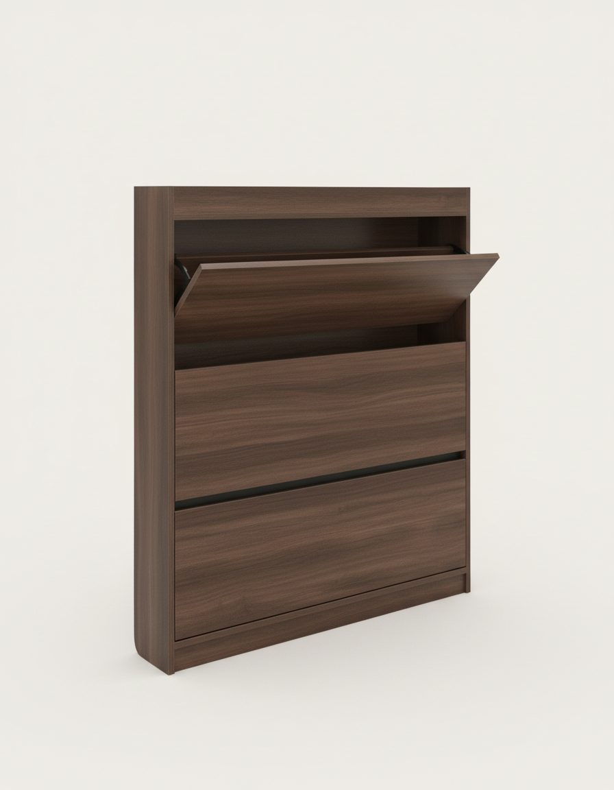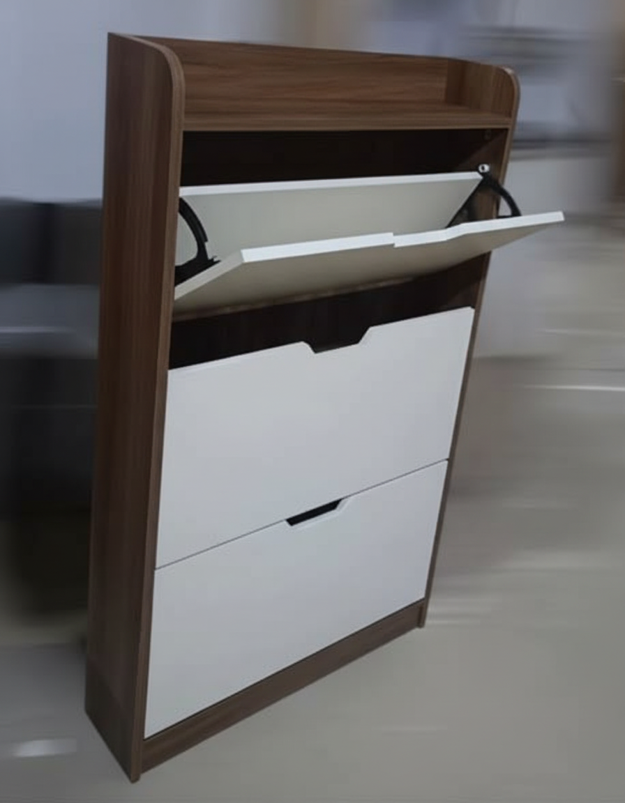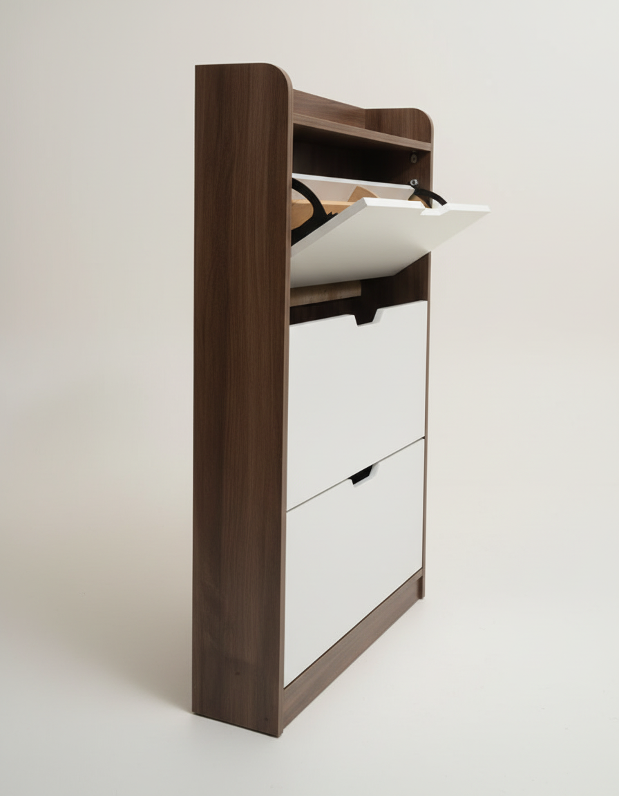 Crafted with a stylish wood finish and clean white panels, this cabinet blends seamlessly with modern and contemporary interiors. The tilt-out compartments allow you to store multiple pairs of shoes in an organized manner while keeping them out of sight, helping maintain a clean and clutter-free environment.